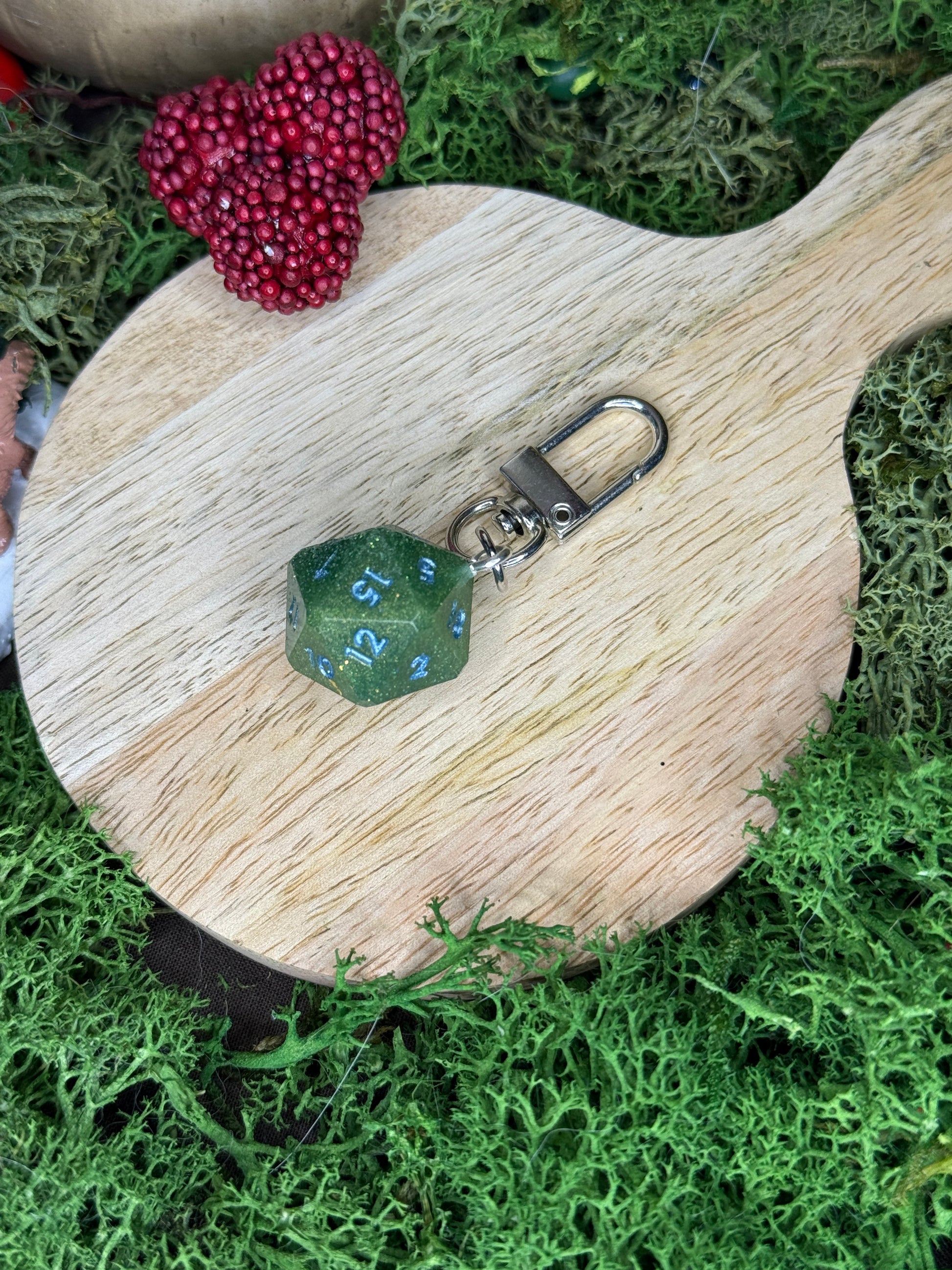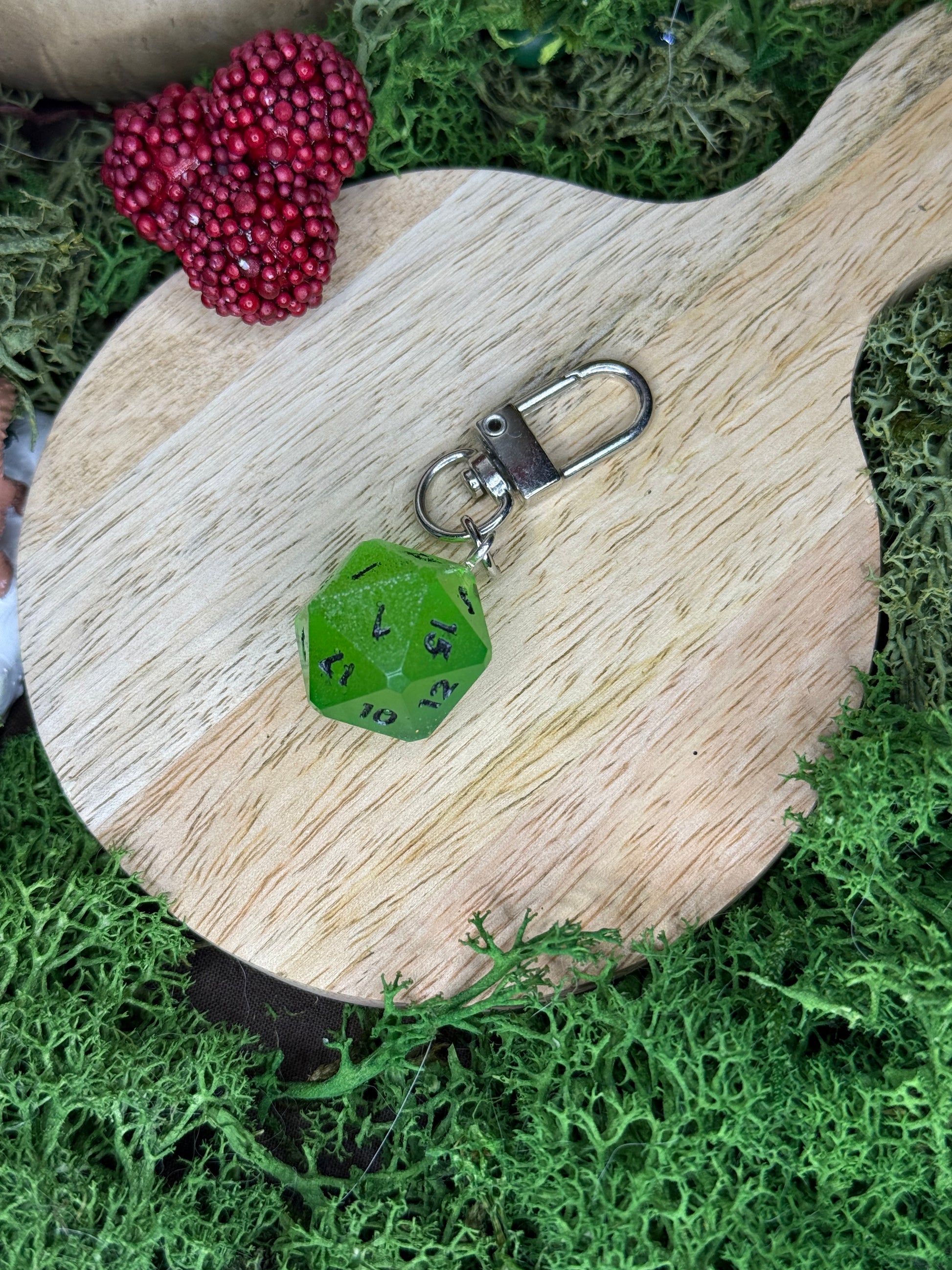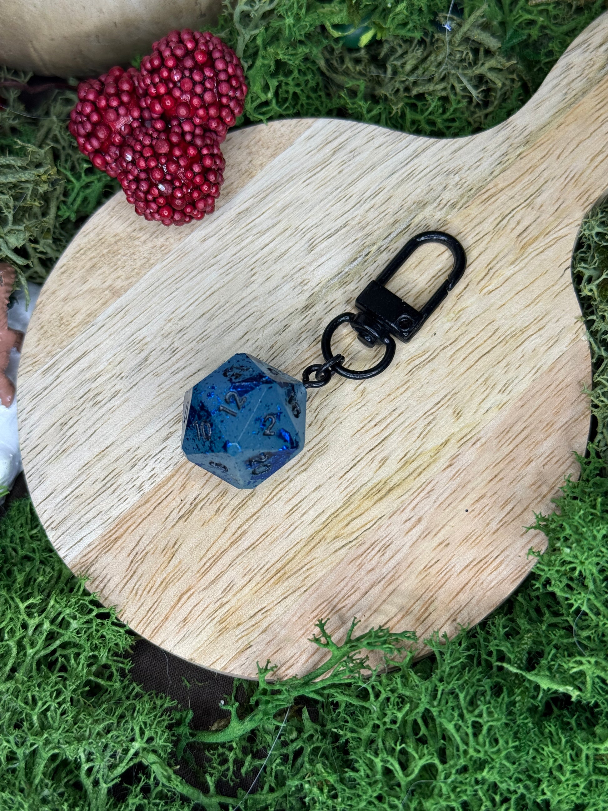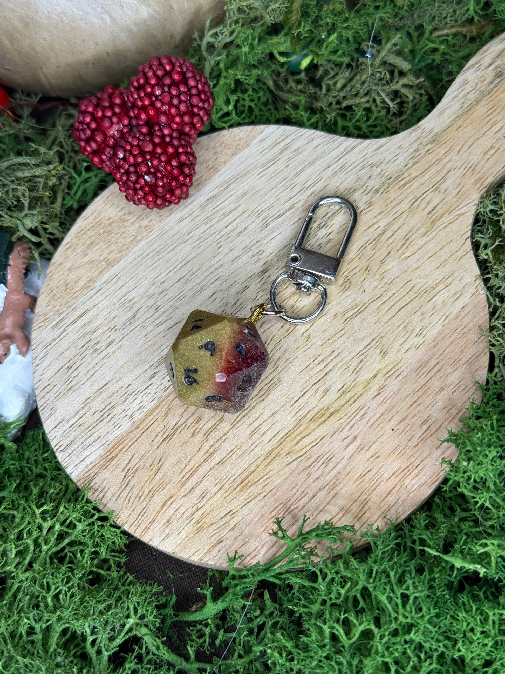 les D20 sont créés par la créatrice L’atelier de Sera, créatrice de dés en résine epoxy.