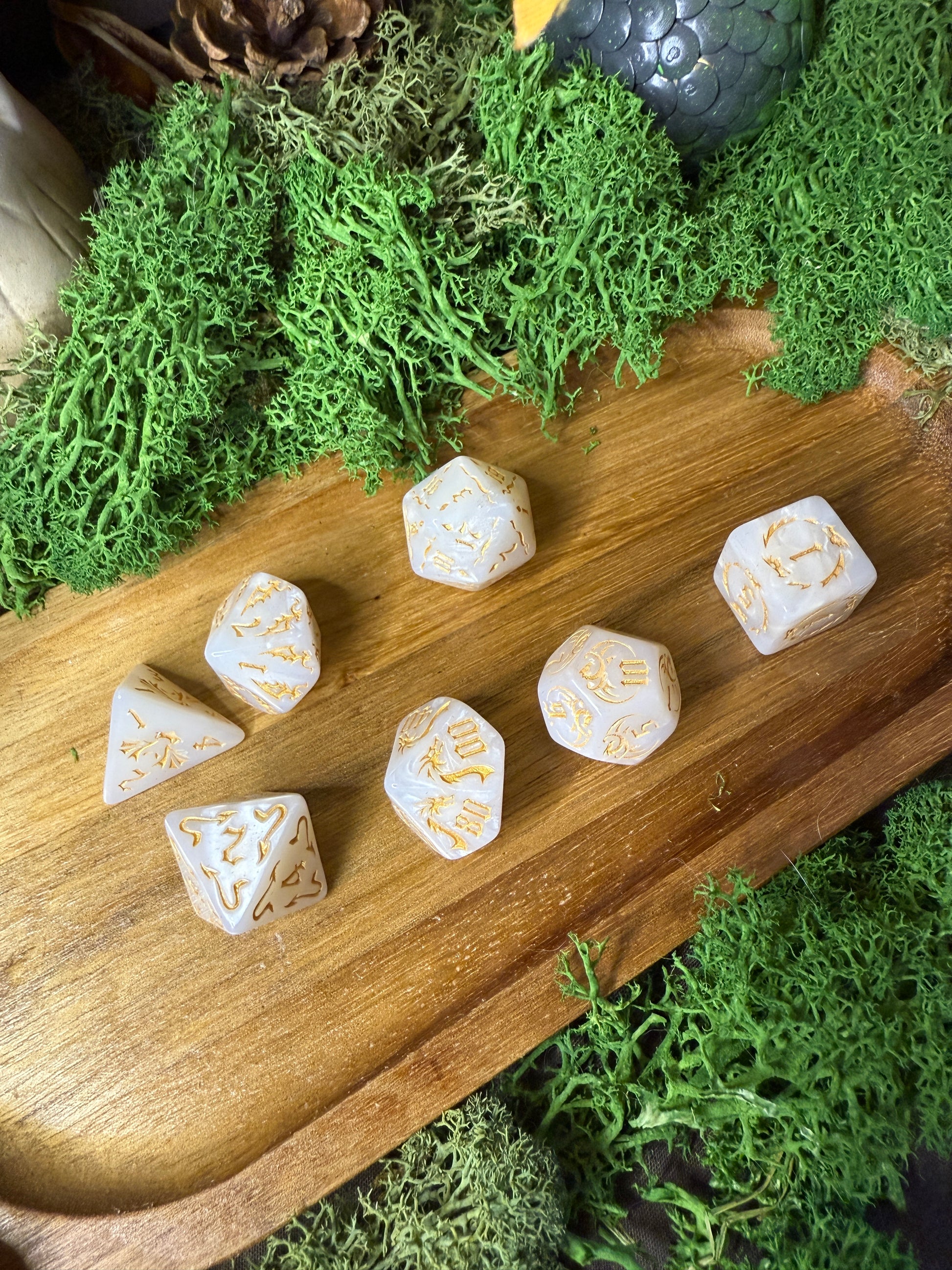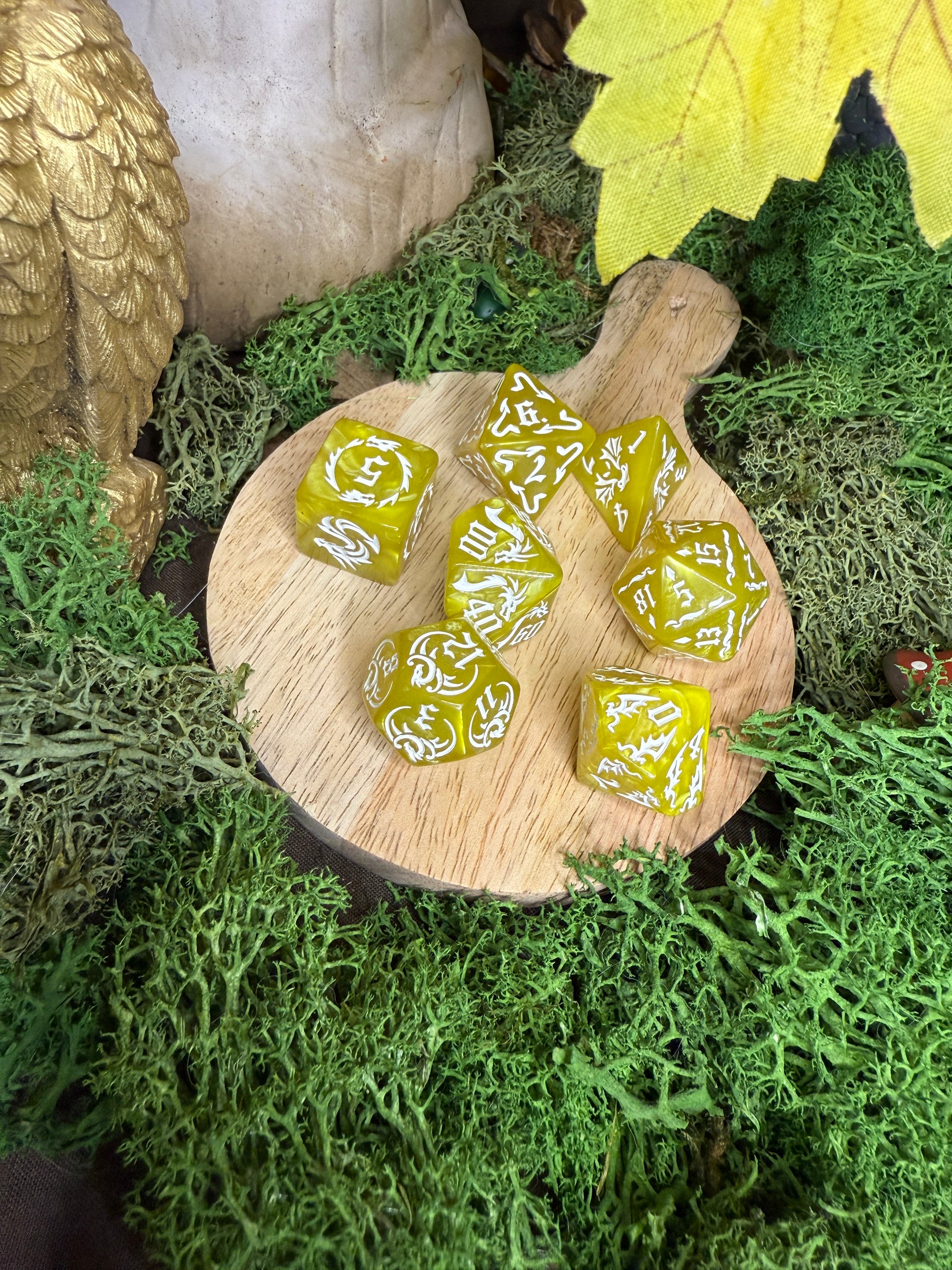 Set de 7 dés à motif de dragons, utilisés principalement dans le jeu de rôle.