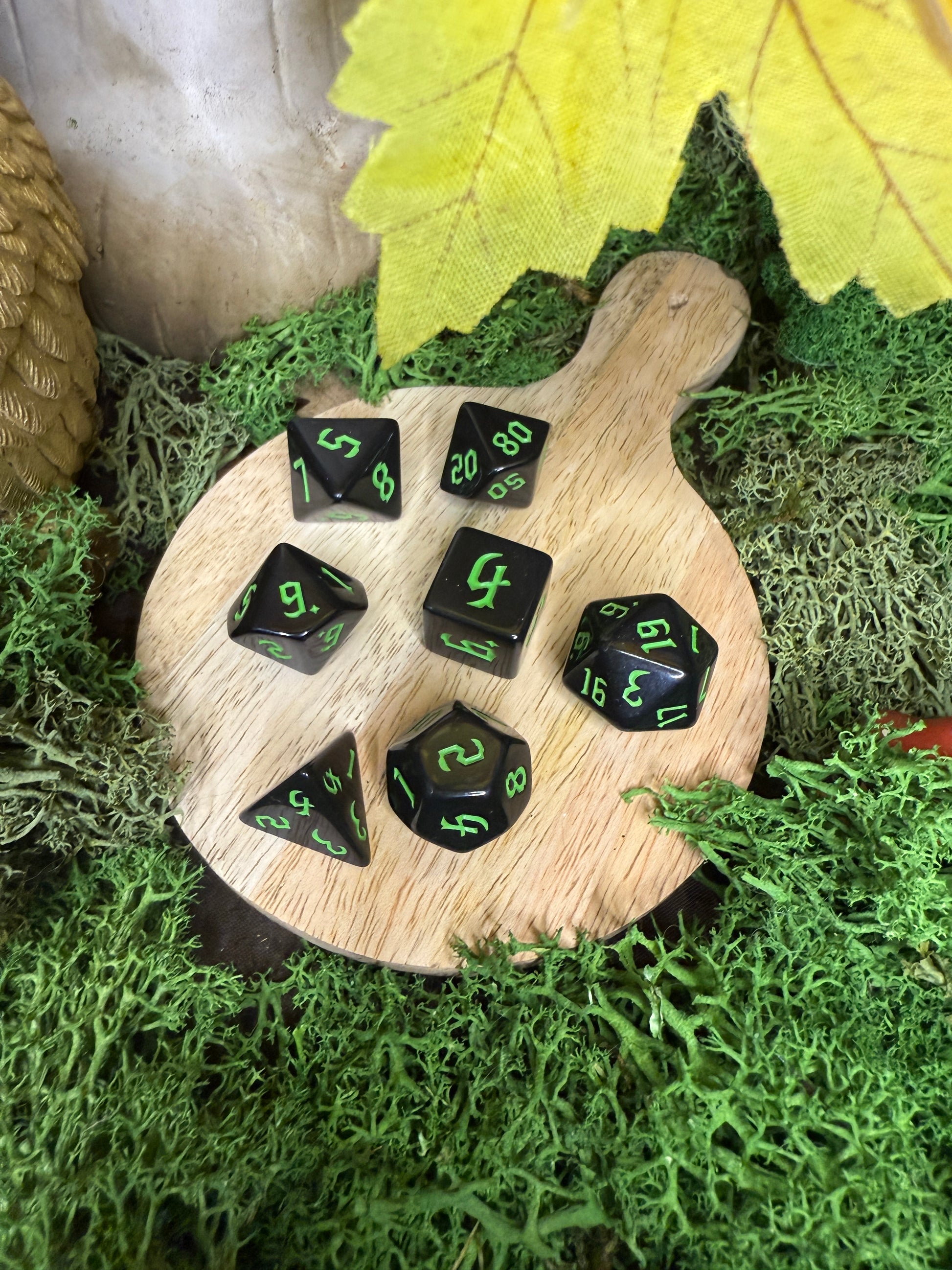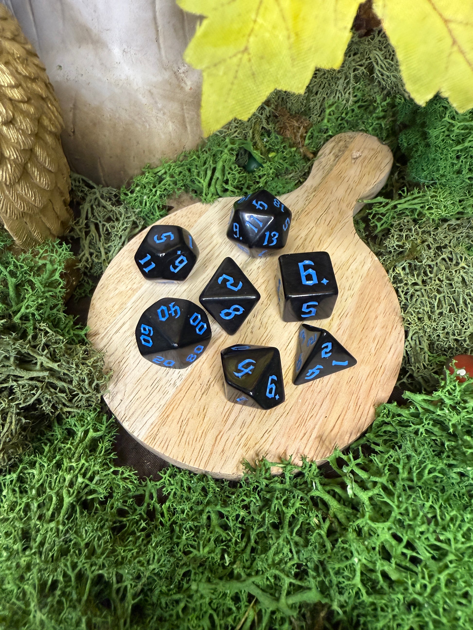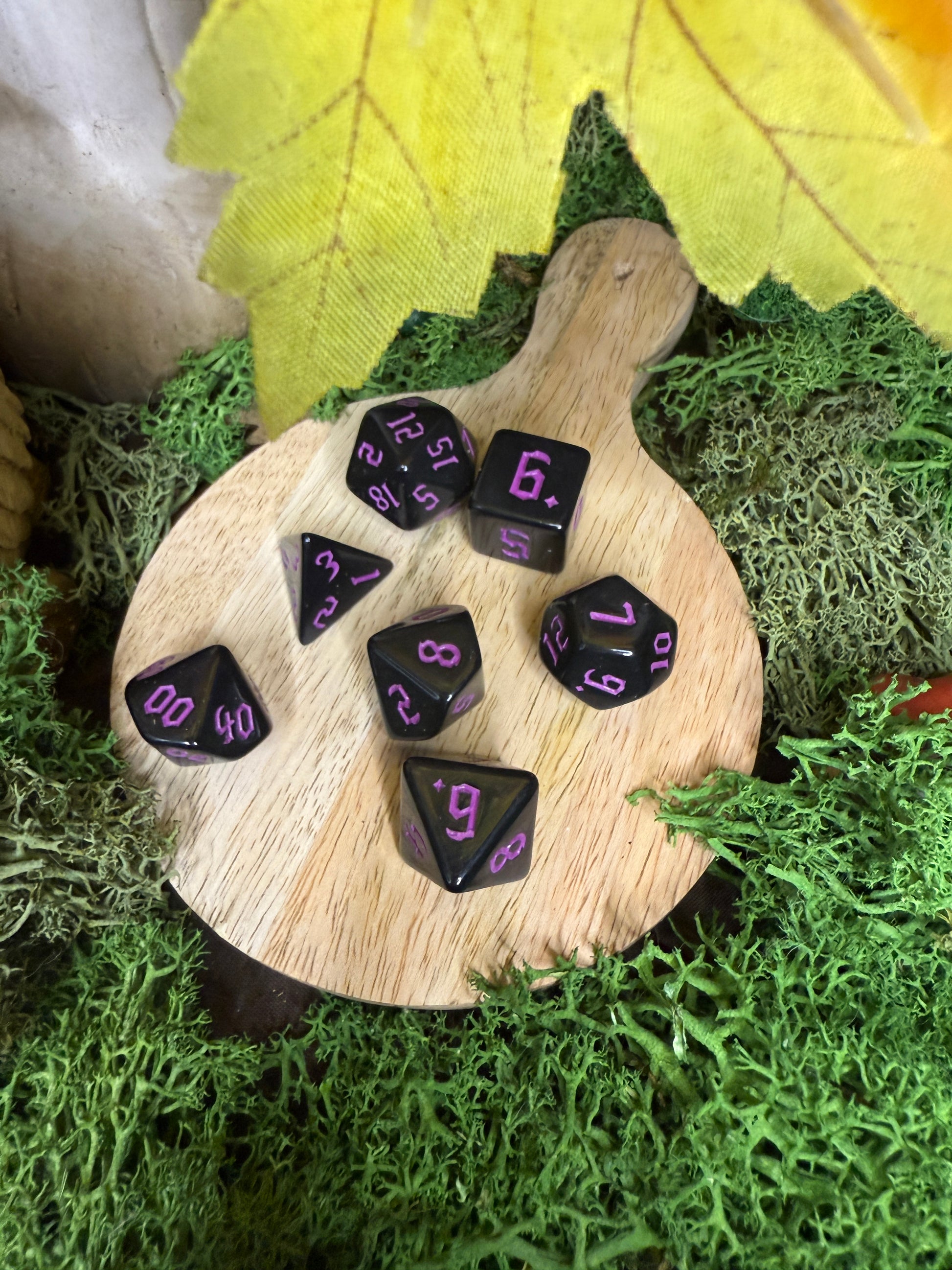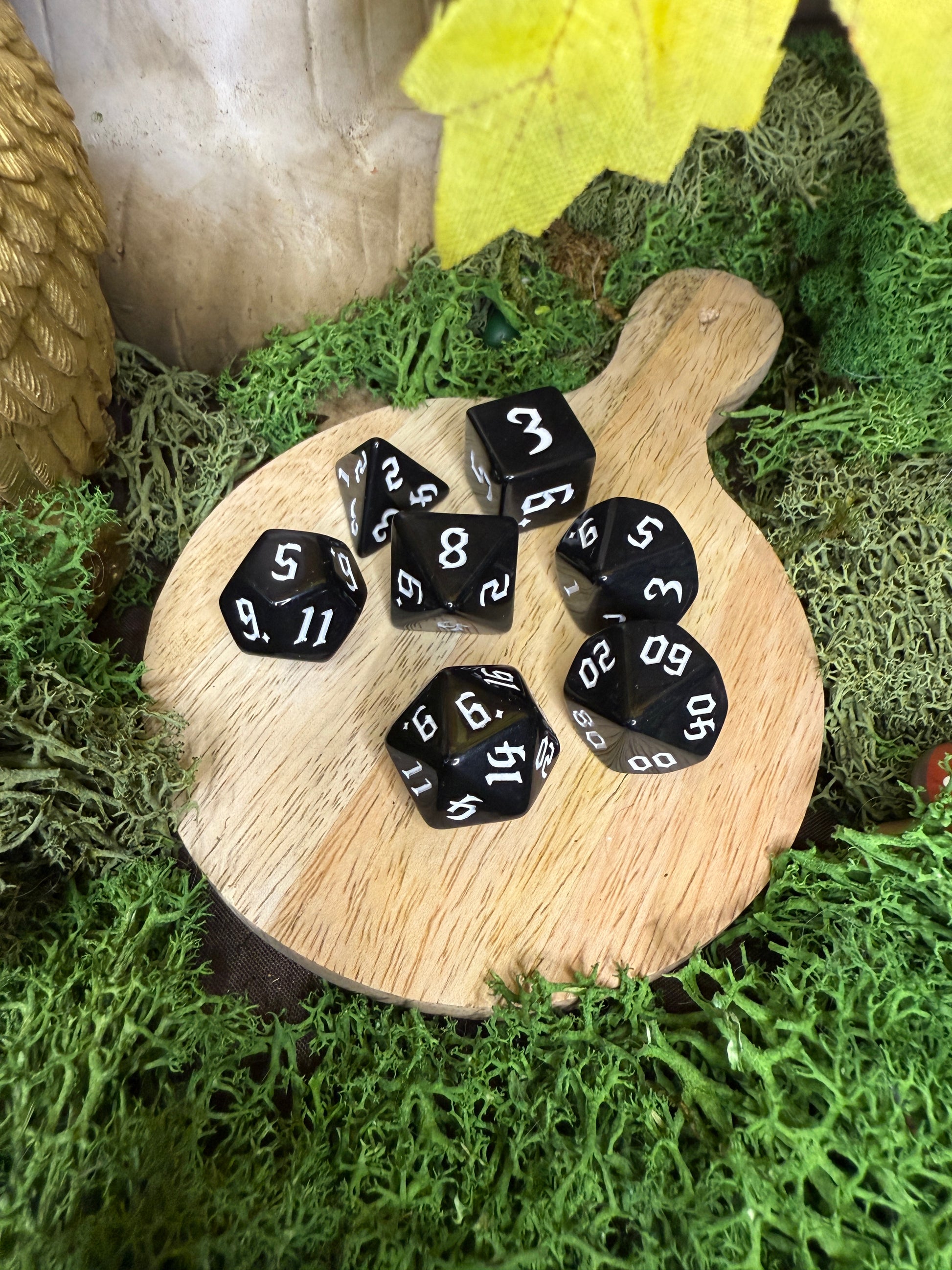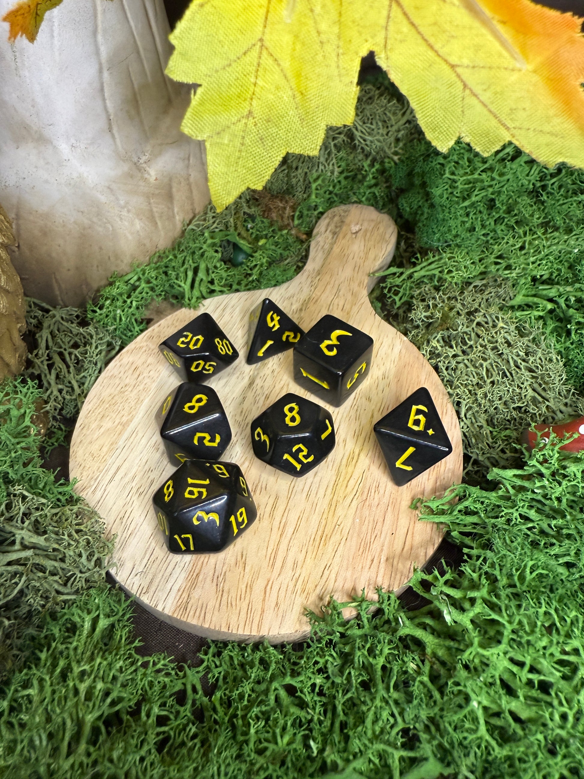 Set de 7 dés noirs écritures de couleurs, utilisés principalement dans le jeu de rôle.